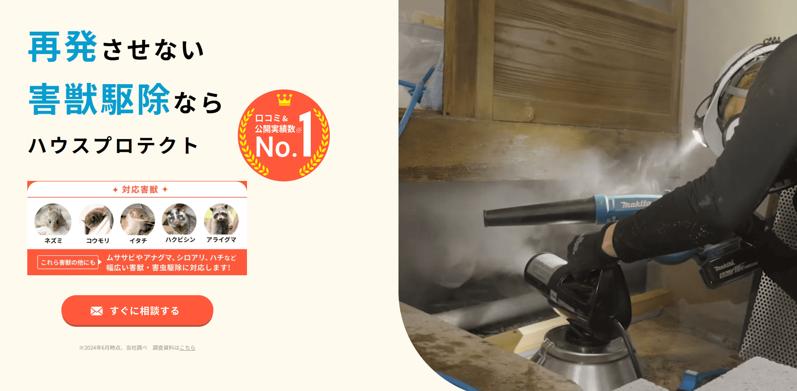 リフォーム工事も可能な技術力と、害獣の習性を熟知した社内スタッフが施工。自社で駆除メディアも運営しており、害獣や駆除に関する知識も豊富。一般社団法人日本有害鳥獣駆除・防除管理協会に加盟。